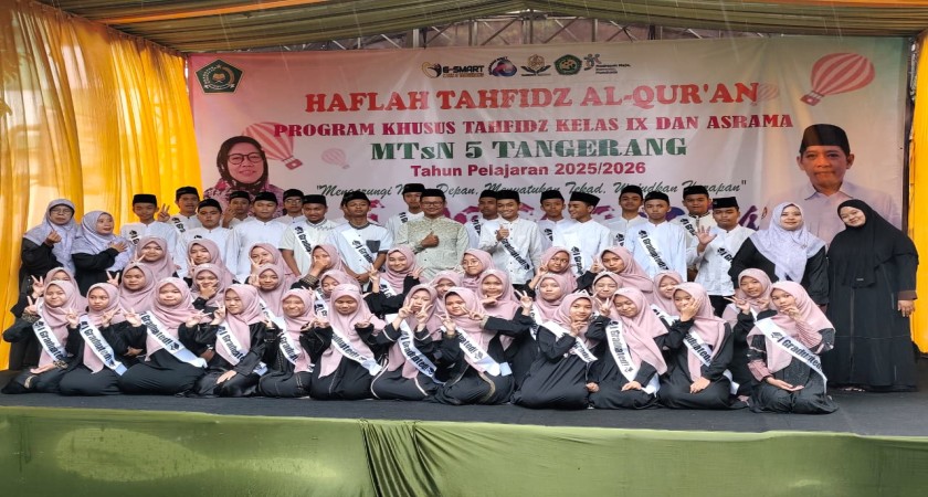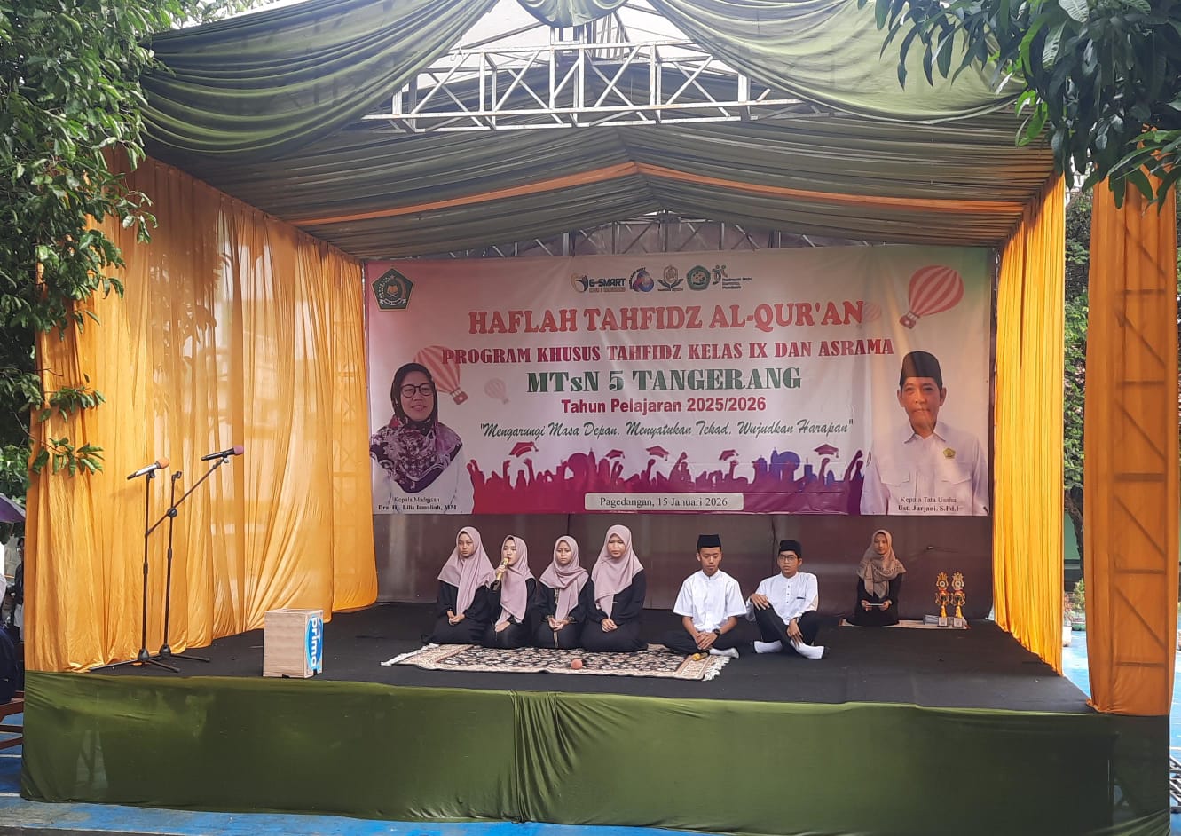 Pagedangan — MTsN 5 Tangerang menyelenggarakan kegiatan Haflah Tahfidz Al-Qur’an bagi peserta didik Program Khusus Tahfidz kelas IX dan Asrama pada Kamis, 15 Januari 2026. Kegiatan yang berlangsung khidmat ini dilaksanakan di halaman MTsN 5 Tangerang dan diikuti oleh 49 peserta didik.